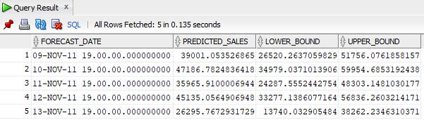 SQL> SELECT * FROM SALES_FUTURE_FORECAST_90D FETCH FIRST 5 ROWS ONLY;