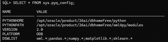 export ORACLE_SID=FREEexport ORACLE_BASE=/opt/oracleexport ORACLE_HOME=/opt/oracle/product/26ai/dbhomeFreeexport PYTHONHOME=$ORACLE_HOME/pythonexport PATH=$PYTHONHOME/bin:$ORACLE_HOME/bin:$PATHexport LD_LIBRARY_PATH=$ORACLE_HOME/lib:$PYTHONHOME/lib:/lib64:$LD_LIBRARY_PATHexport PYTHONPATH=$ORACLE_HOME/oml4py/modules